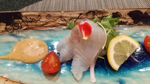 (突きだし) 三河湾水揚げ白身魚のカルパッチョ 今回はマダカです。 (前菜)月替わりのオードブル 茸と鶏肉の素敵なマリアージュ ガランティーヌ 洋風アレンジのブリと大根の優しいハーモニー かわいい小鉢で季を愉しめる野菜と共に 粒マスタード薫る色彩と甘…